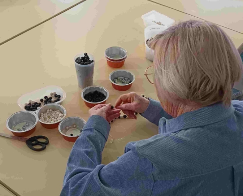 - Jeanne, Régine, Anne-Marie, Soizig et Jean-Claude ont peint les perles et assemblé les accessoires (bâtonnets avec des étoiles, des moustaches, des lèvres rouges, des nœuds papillon).