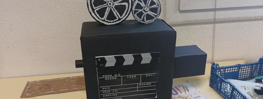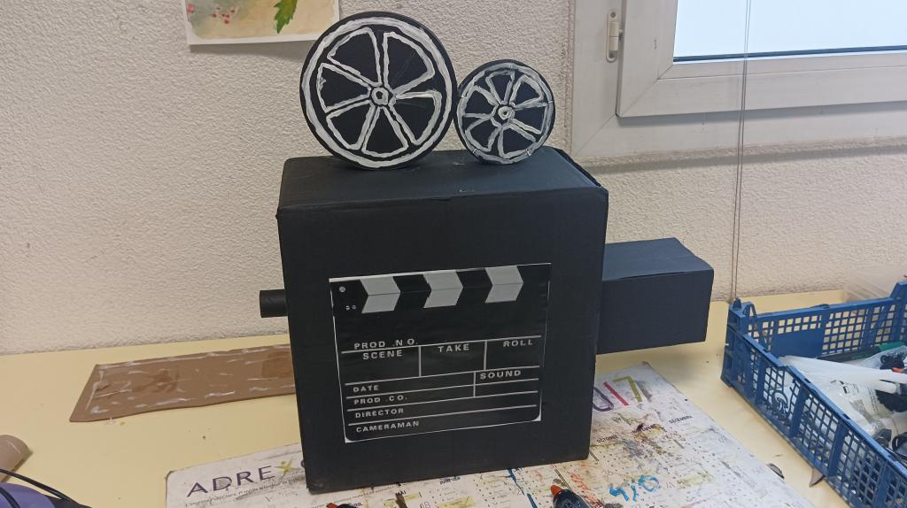 La caméra est déjà terminée, mais il reste encore d’autres accessoires à finir comme l’assemblage des colliers à perles, la décoration des boîtes pour les ouvreuses ou la fabrication des cannes de charlot.