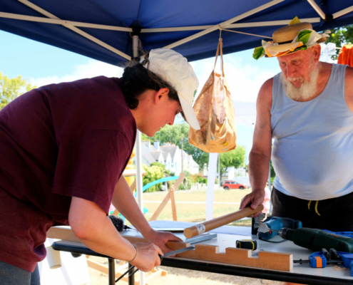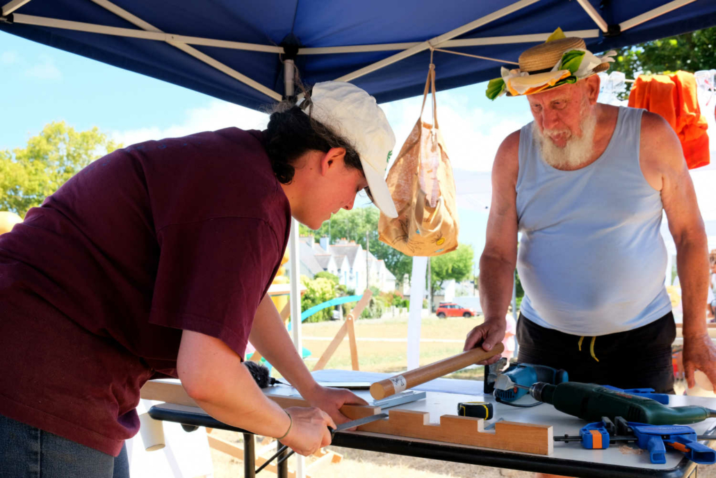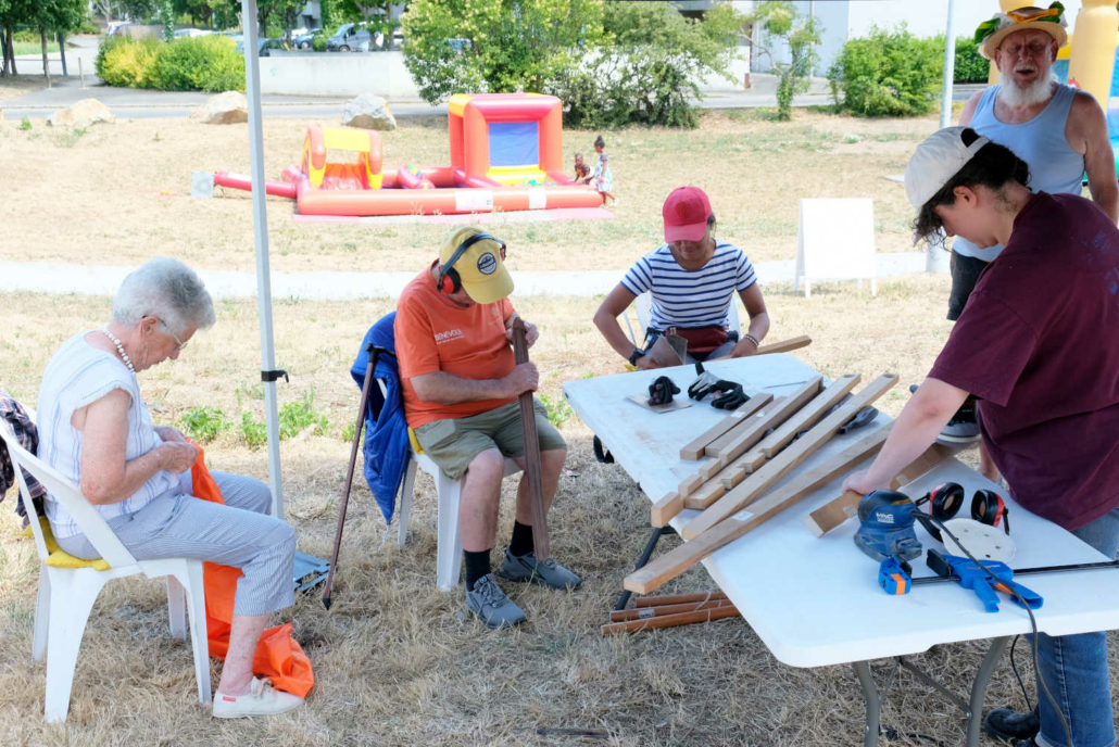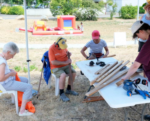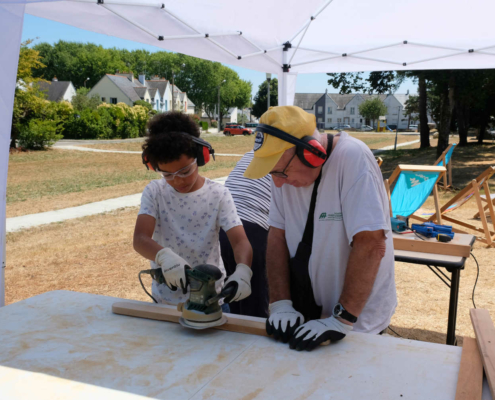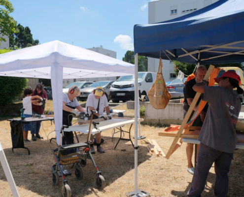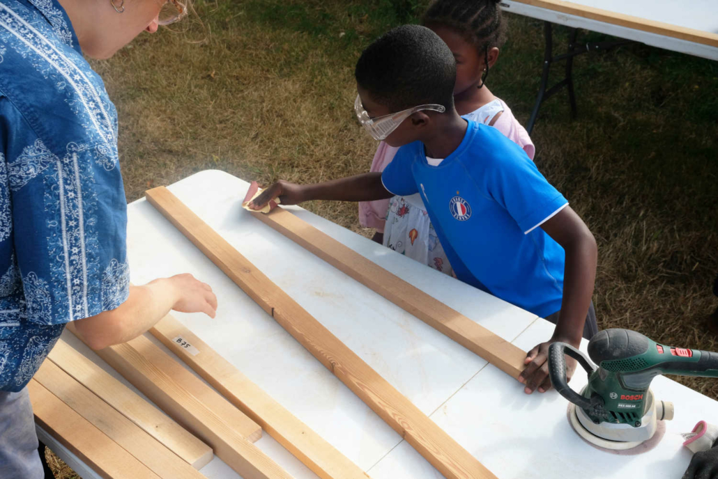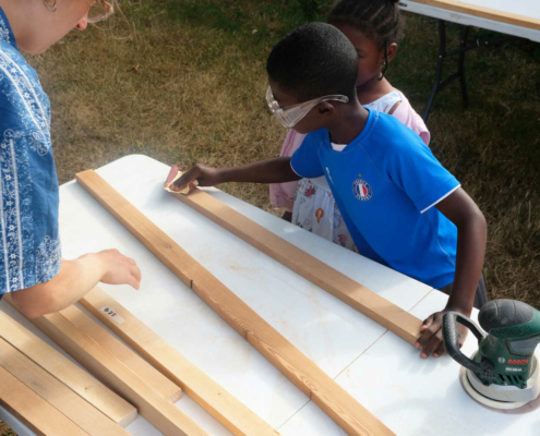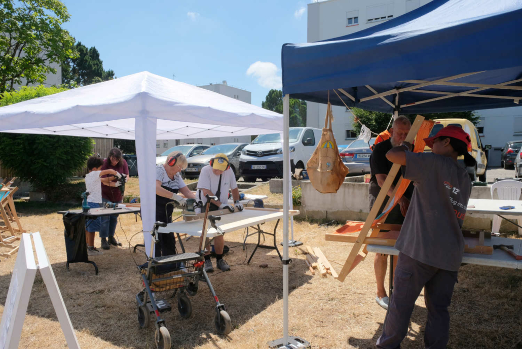 - D’autres bénévoles se sont quant à eux occupés de la partie menuiserie. Ils ont poncé, coupé et assemblé le bois pour construire la structure robuste des transats.
