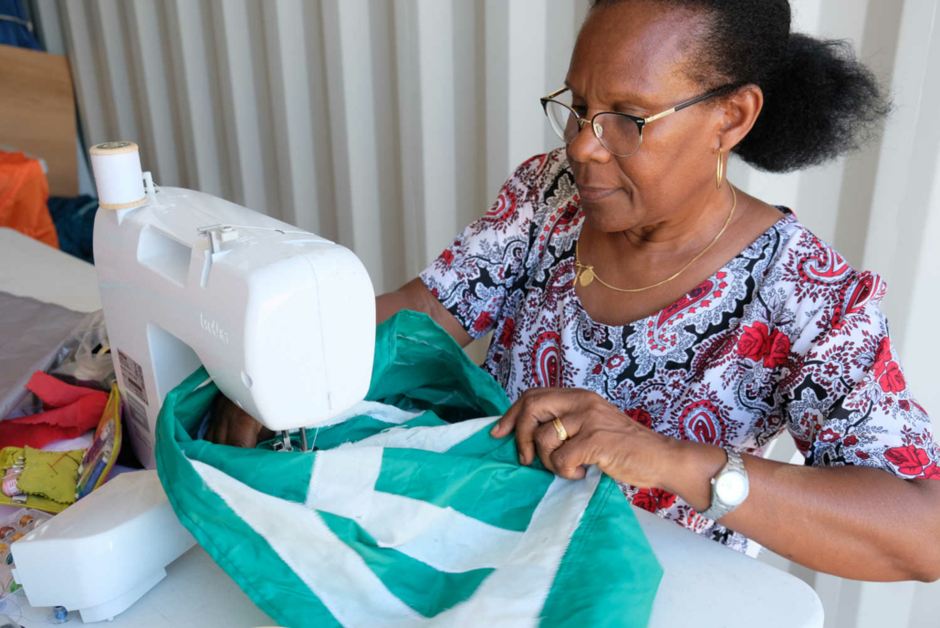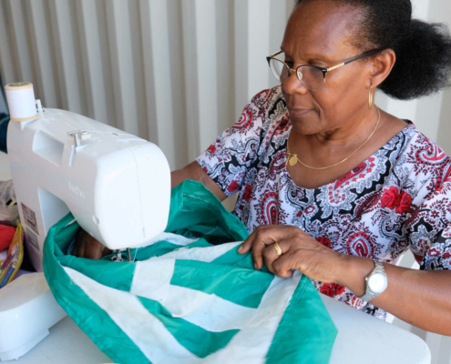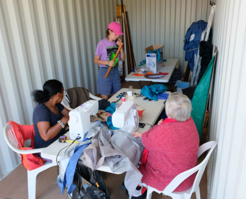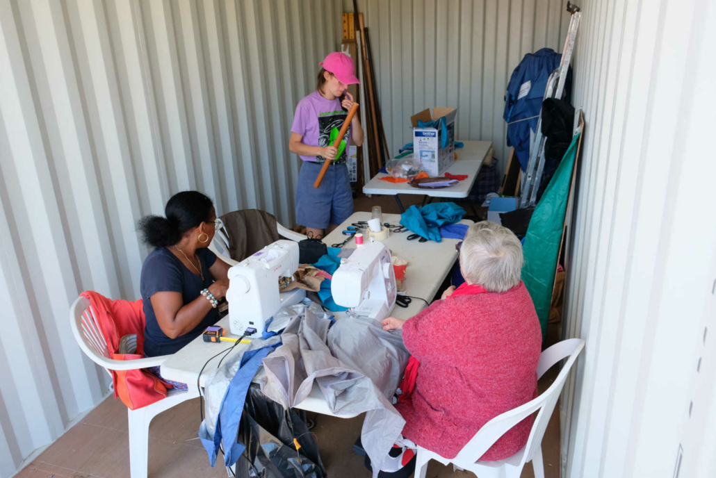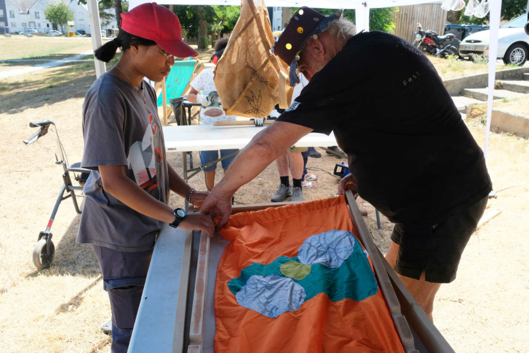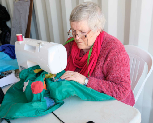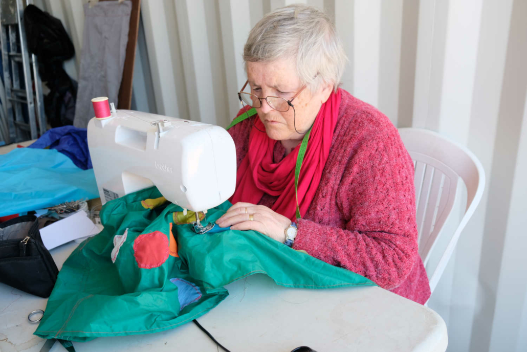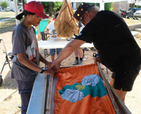 - Certaines bénévoles douées en couture se sont attelées à la fabrication des toiles à partir de toiles de tente. Ainsi, Hélène, Victoire et Mélanie ont fait preuve de beaucoup d’imagination pour coudre des motifs sur les toiles, évoquant les souvenirs des habitants de leur quartier (terrain de football ou de pétanque, trottinettes, toboggans…).