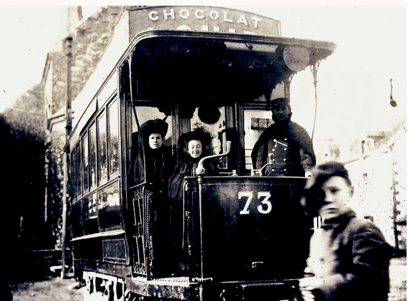 Le Wattman pose avec deux dames, ainsi qu’un homme jeune au premier plan.