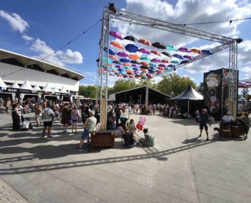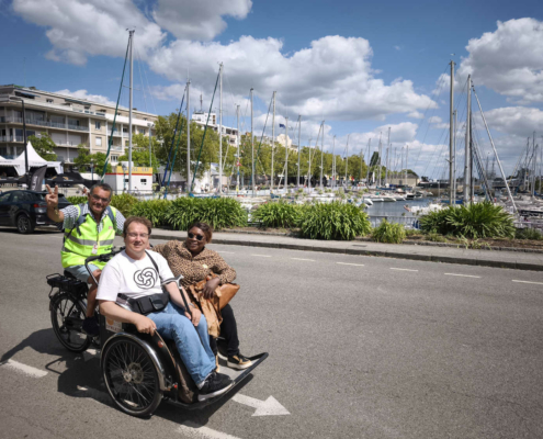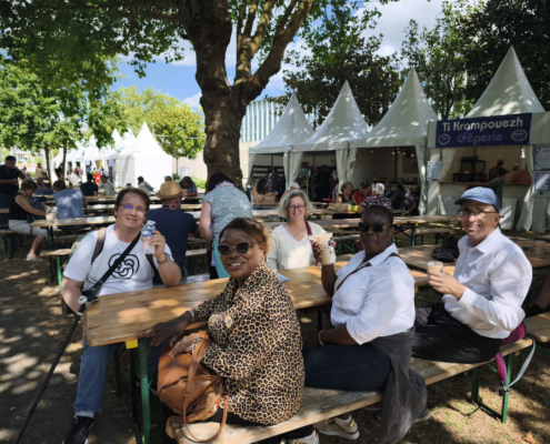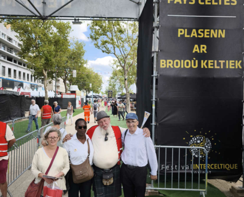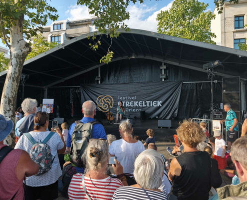 En chemin vers le Palais des Congrès, nous avons déambulé à travers le marché des artisans et découvert la scène des pays celtes. Nous avons croisé Michel, bénévole engagé au centre social et au festival depuis de nombreuses années… Ce festival ne serait rien sans eux, alors merci pour leur engagement ! Olivier a contacté l’association Syklett afin de rejoindre le palais plus rapidement à l’aide d’un triporteur. N’hésitez pas à les joindre au 07 43 22 42 63.