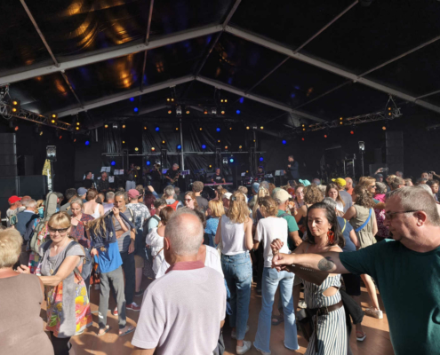 Nous avons ensuite rejoint les terrasses du festival et leur scène musicale, avant de réserver nos places au quai de la Bretagne pour le concert très attendu du collectif Breizh Amerika. Une rencontre unique entre musique bretonne et jazz, portée par Charles Kergaravat, fondateur de l’association Breizh Amerika, qui tisse des ponts culturels et économiques entre la Bretagne et les États-Unis (plus d’infos). Deux musiciens venus de Louisiane, George Brown (trombone) et Chantz Powell (trompette) ainsi que Julien Le Mentec (clavier), Gweltaz Rialland (saxophone, bombarde), Thibault Niobé (guitare) ont enflammé la soirée lorientaise !