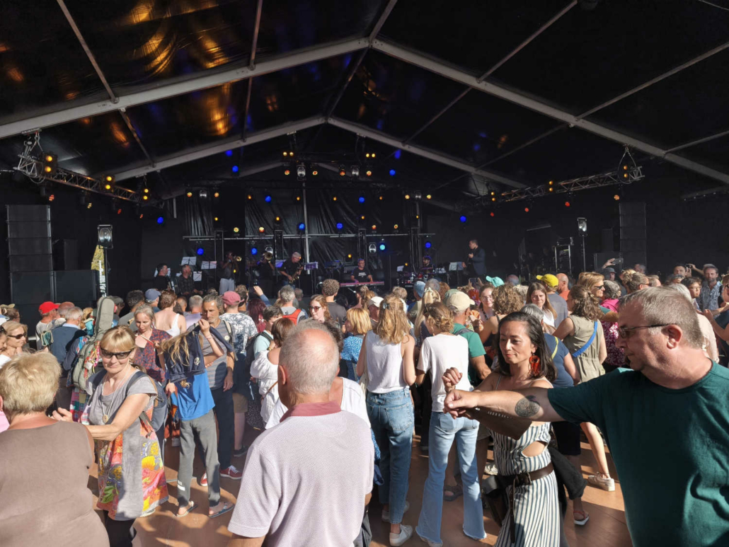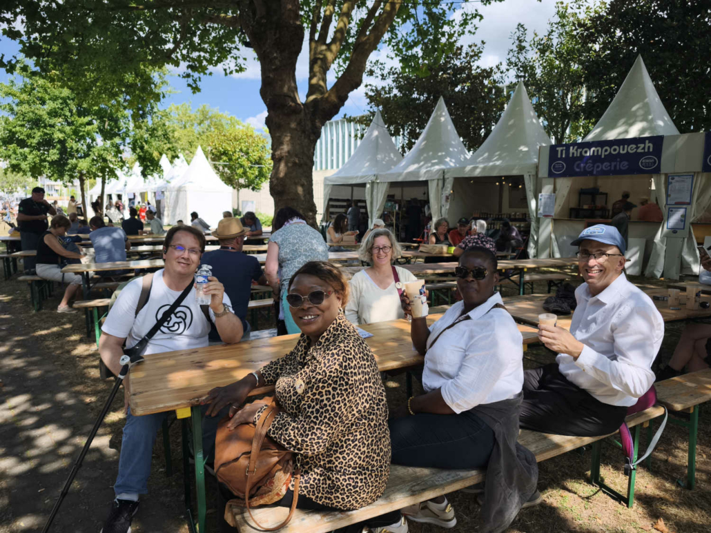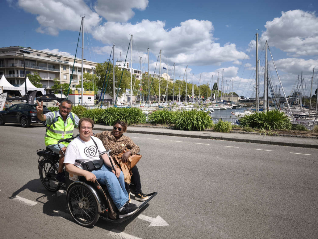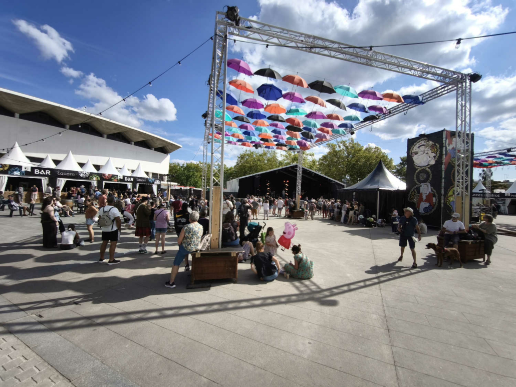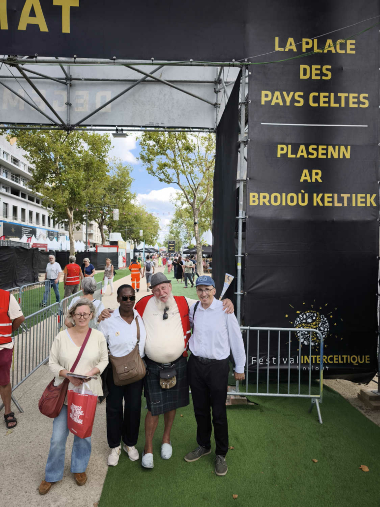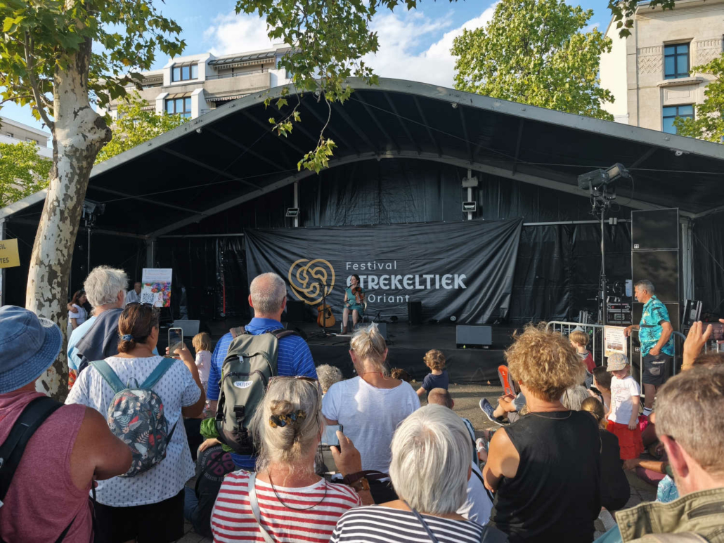 En chemin vers le Palais des Congrès, nous avons déambulé à travers le marché des artisans et découvert la scène des pays celtes. Nous avons croisé Michel, bénévole engagé au centre social et au festival depuis de nombreuses années… Ce festival ne serait rien sans eux, alors merci pour leur engagement ! Olivier a contacté l’association Syklett afin de rejoindre le palais plus rapidement à l’aide d’un triporteur. N’hésitez pas à les joindre au 07 43 22 42 63.