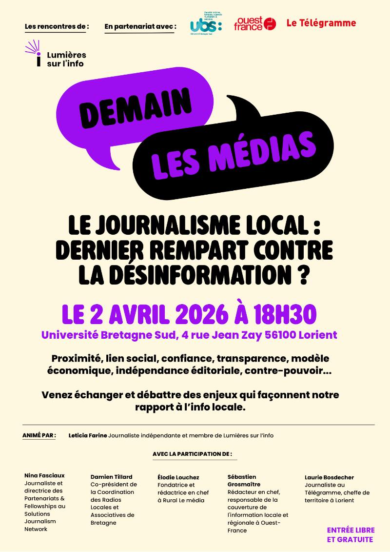 Deux semaines après le second tour des élections municipales du 22 mars, véritables « JO » de l’information locale, l’association Lumières sur l’info, en partenariat avec Ouest France, Le Télégramme et l’Université Bretagne Sud, propose une soirée de débat consacrée au rôle du journalisme de proximité face à la désinformation.