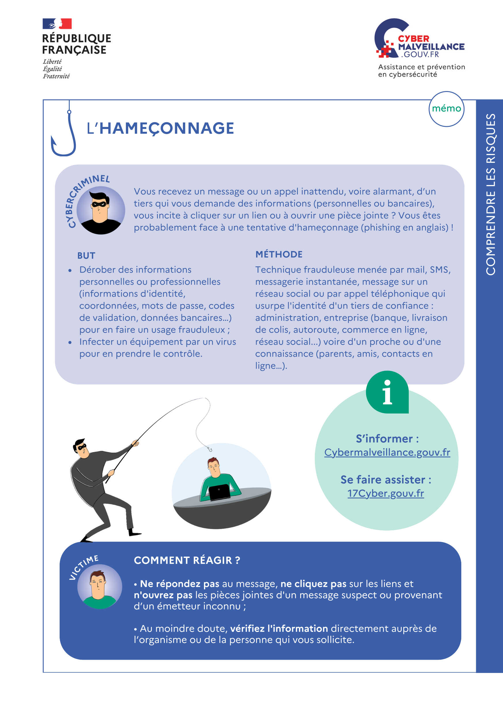 L’hameçonnage, ou phishing, est une technique frauduleuse menée par courriel, SMS, messagerie instantanée, etc. qui usurpe l’identité d’une administration, d’une entreprise, voire d’un proche ou d’une connaissance.