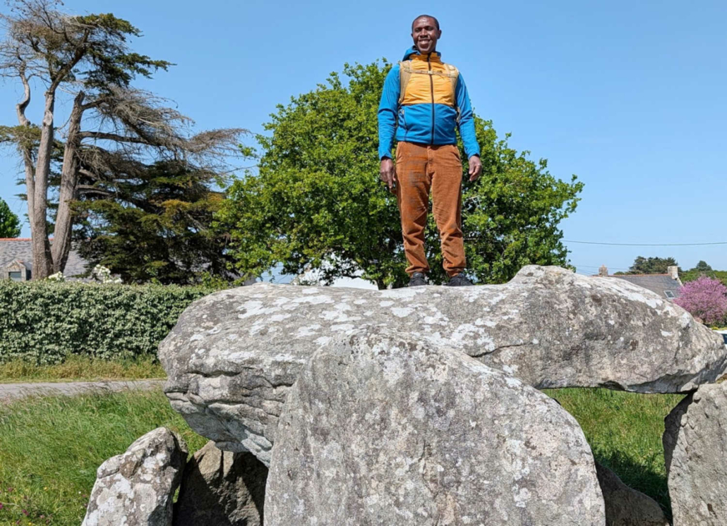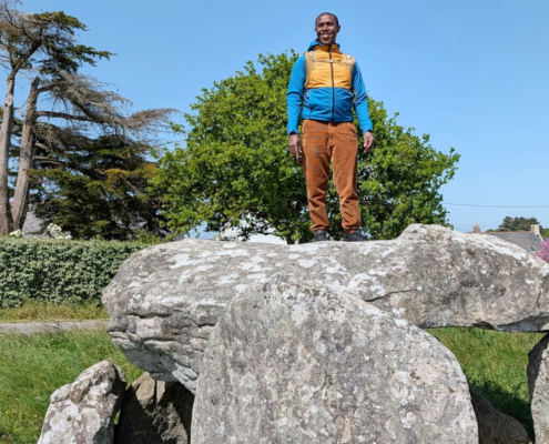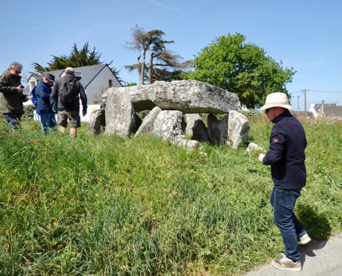 Assez admiré. Frédéric nous entraîne vers un dolmen pour que nous ayons bien conscience que le lieu a une dimension néolithique. Nous ne sommes pas loin de Carnac. Nous poursuivons sur le chemin côtier bordé de murets clôturant des terrains sur lesquels sont bâties de jolies maisons. Frédéric nous propose de nous asseoir sur un de ces murets pour une pause durant laquelle il va nous conter une anecdote locale. Le garnement, la sorcière et le chat qui crachait, qui miaulait et qui feulait et qui après bien des péripéties a rendu muet le garnement en lui mangeant la langue. Mais pas de garnement dans notre groupe et personne ne feulait.