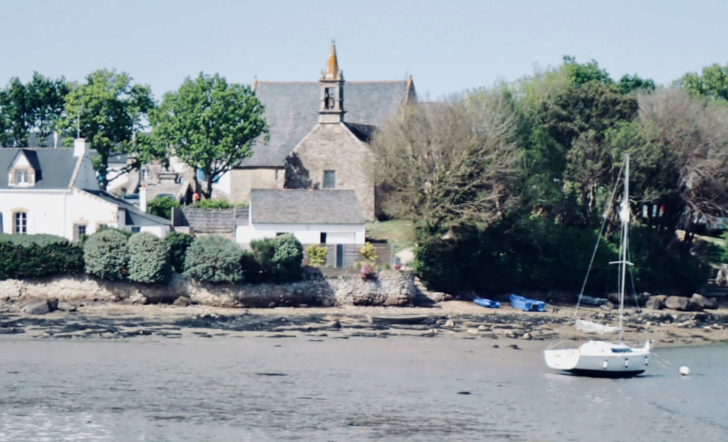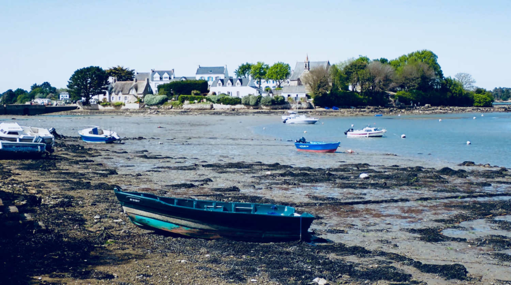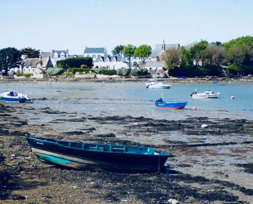 Cet après-midi, le vent nous oblige à bien visser nos chapeaux sur nos têtes. Le temps est bien clair, le ciel est bleu. Nous pouvons contempler les nombreux îlots parsemés sur la ria et sur lesquels une végétation verdoyante s’est développée (arbres, arbustes, c’est sûr, buissons, prairies sans doute mais il faudrait y voir mieux car il y a de la distance entre eux et nous) et parmi cette végétation, très peu de maisons, assez basses, habitées ou non. La mer est d’un bleu gris presque métallique. De forts courants la parcourent, des bancs de sable la fractionnent (nous sommes à marée basse). Des rochers, des empilements de rocailles affleurent dans les vasières et près de nous les barques amarrées au rivage se sont échouées sur ces vasières.