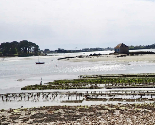 Suite de l’aventure à Saint Cado.« – ça me fait penser au Mont Saint Michel » mentionne Loïc. La fréquentation, le chemin entre deux eaux pour accéder au lieu, le caractère religieux permettent effectivement de faire le rapprochement, ça ne gâte en rien notre plaisir. Daniel préférerait toutefois une autre couleur que le blanc pour le pignon de la célèbre maison qu’il nous désigne. Tout est perfectible. Frédéric nous prévient : « – comme sur le chemin, il y a de nombreux panneaux explicatifs, je n’apporterais que des compléments. Arrêtons-nous ici près de ces parcs à huîtres» décide-t-il.