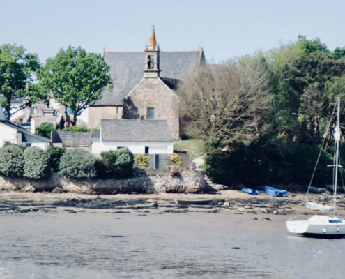 Et puis ensuite nous empruntons une rue montante qui nous amène vers le calvaire et la chapelle. Les informations sur ces constructions nous sont livrées par quatre grands panneaux qui sont installés en face de la chapelle. Il y est question d’histoire des lieux, d’architecture, de rénovation, du moine Saint Cado venu du pays de Galles au VI siècle (il construisit un oratoire), des moines de l’abbaye Sainte Croix de Quimperlé (ils construisirent la chapelle). C’est moins dynamique et interactif comme transmission de savoir qu’avec Frédéric. Qu’en dirait les moines ? Contentons-nous de contempler les pierres qu’ils ont assemblées au fil des siècles et les beaux vitraux mis en place récemment.