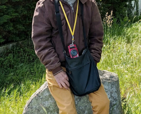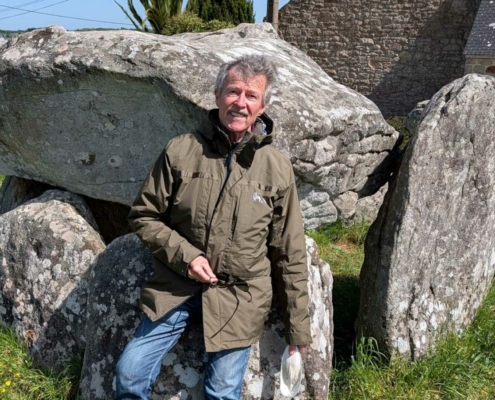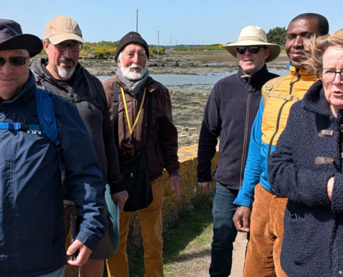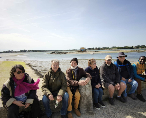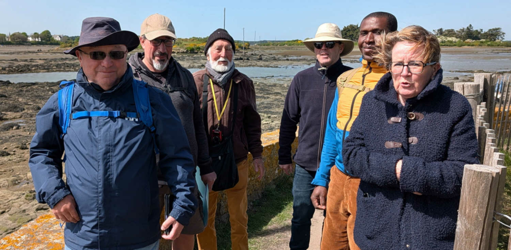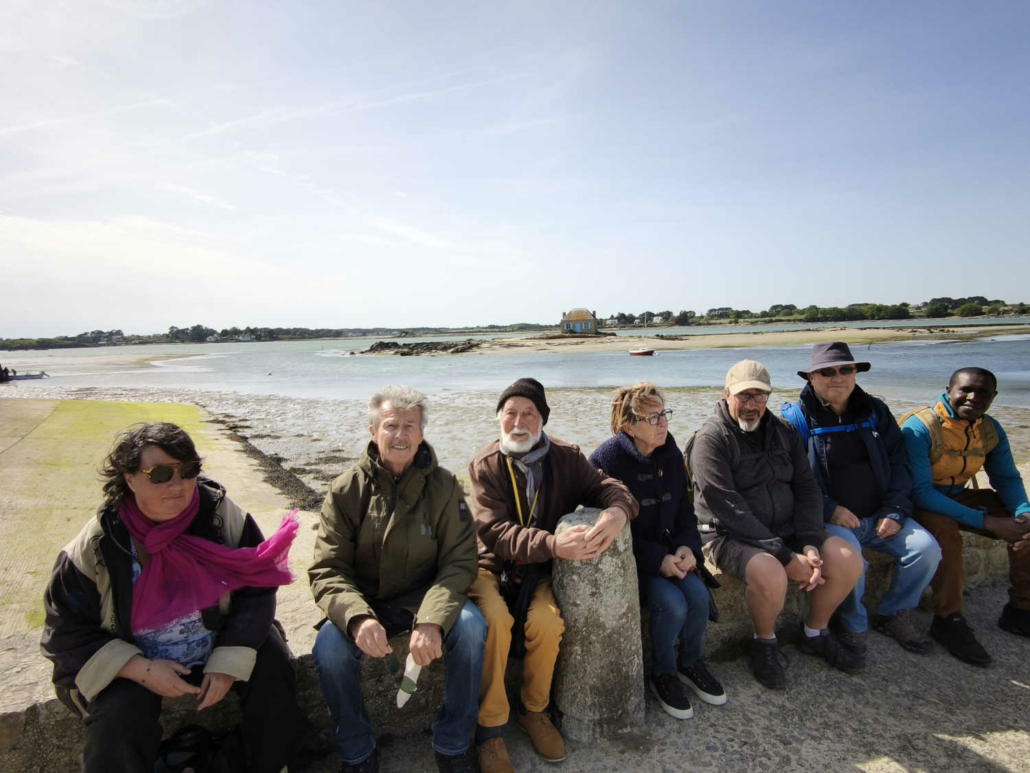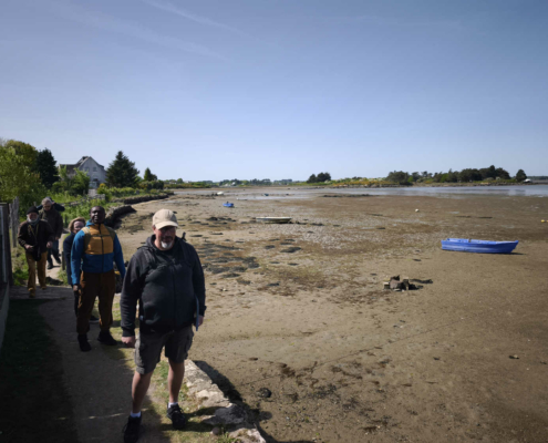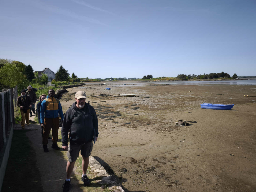 Il nous fait partager ses connaissances dont bien sûr la surface de la ria (la rivière d’Étel mesure 35 km, son aber recouvre 22 km2 et pénètre à l’intérieur des terres sur 15 km), la longueur des chemins qui la bordent (240 km de sentiers) . Mais aussi : « – la rivière prend sa source à Languidic et coule vers l’Océan Atlantique, son embouchure se situe au niveau de la ville d’Etel et sa célèbre barre (banc de sable sous-marin précise-t-il), la légende, c’est celle de Brigitte et de sa poignée de sable ! (la Brigitte de notre groupe semble un peu déçue que la visite de la chapelle Sainte Brigitte ne soit pas prévue au programme) » « – pourquoi le mot Ria » poursuit-il « et non aber très utilisé en Bretagne ? Fjord, non, un fjord c’est une ancienne vallée glacière ; en fait ria, c’est le mot d’origine espagnol employé par la géographie internationale. Tôt le matin quel plaisir de prendre son café en face de ce paysage merveilleux .» Nous le croyons.