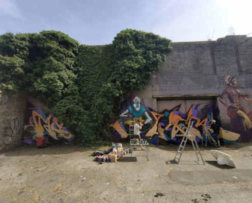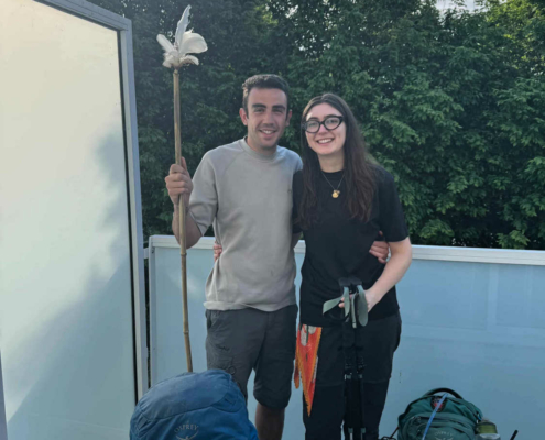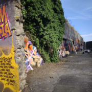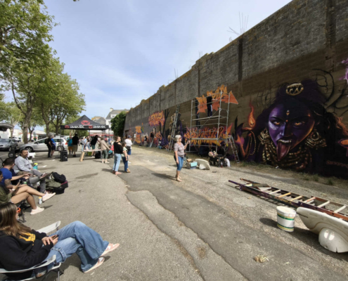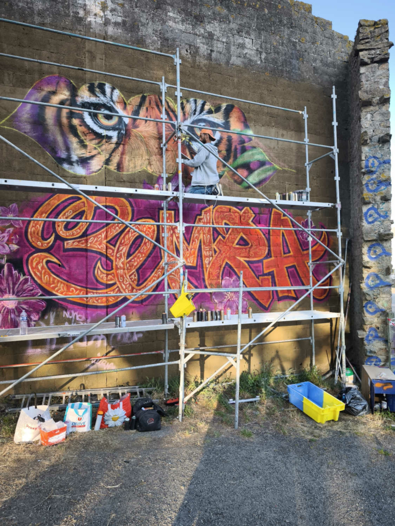 Et puis ensuite nous empruntons une rue montante qui nous amène vers le calvaire et la chapelle. Les informations sur ces constructions nous sont livrées par quatre grands panneaux qui sont installés en face de la chapelle. Il y est question d’histoire des lieux, d’architecture, de rénovation, du moine Saint Cado venu du pays de Galles au VI siècle (il construisit un oratoire), des moines de l’abbaye Sainte Croix de Quimperlé (ils construisirent la chapelle). C’est moins dynamique et interactif comme transmission de savoir qu’avec Frédéric. Qu’en dirait les moines ? Contentons-nous de contempler les pierres qu’ils ont assemblées au fil des siècles et les beaux vitraux mis en place récemment.