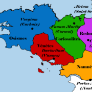 En 57 av. J.-C., Jules César conquiert la région. Les Vénètes résistent mais sont vaincus lors d’une grande bataille navale dans le Morbihan. La Bretagne devient alors romaine : routes, villes et nouvelles habitudes apparaissent.